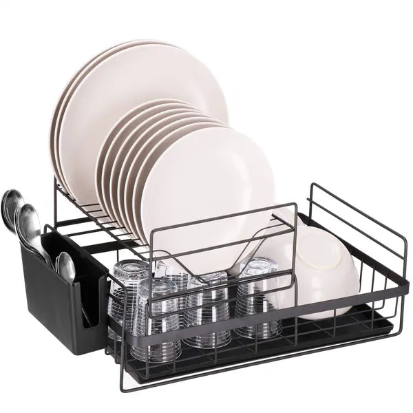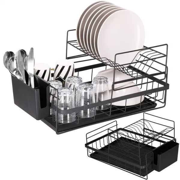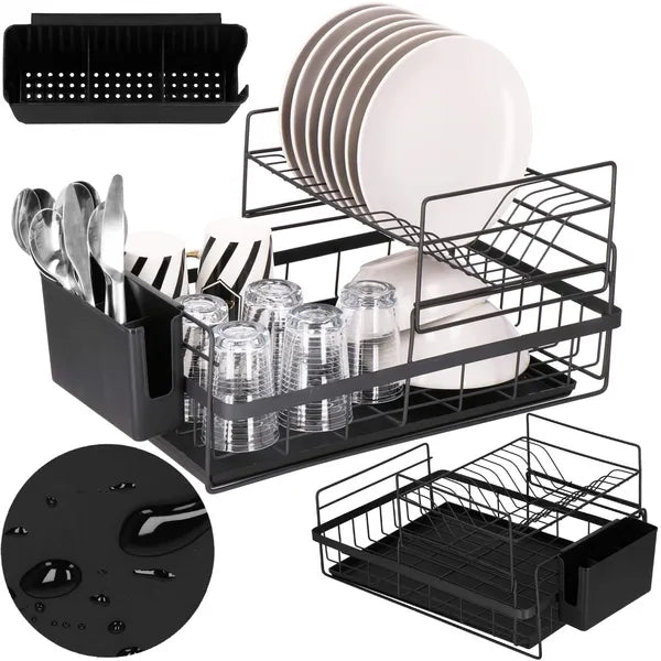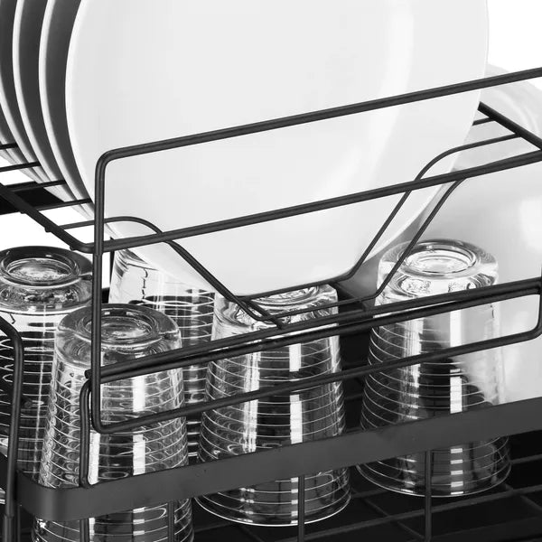 Praktikus, kétszintes edényszárító stílusos fekete színben, masszív acél vázzal és kivehető műanyag csepegtetőtálcával, hogy a konyhapult mindig rendezett és száraz maradjon.