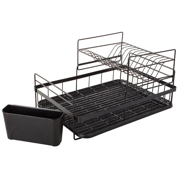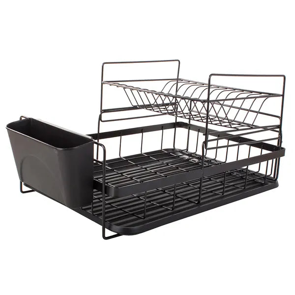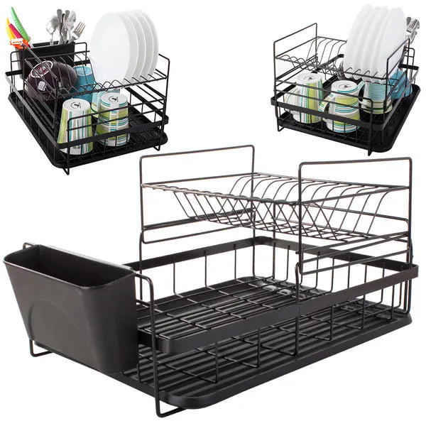 A kétszintes, porfestett fém edényszárító egyszerre modern, tartós és helytakarékos. A fekete loft stílusú állvány elegánsan mutat bármely konyhapulton, miközben a nagyméretű csepegtetőtálca megakadályozza, hogy a lecsöpögő víz kárt tegyen a bútorban.