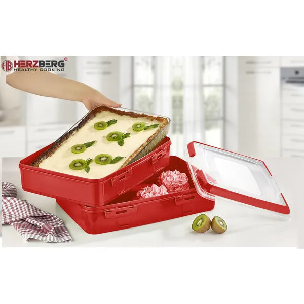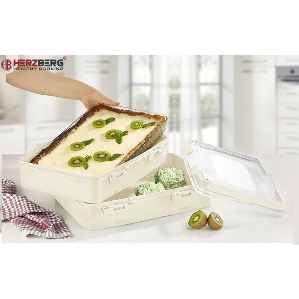 Vidd magaddal kedvenc tortáidat és pitéidet anélkül, hogy aggódnod kellene a krémek elcsúszása vagy a morzsák szétszóródása miatt! Az elefántcsont színű, 42×29×18 cm-es süteményszállító doboz egyszerre két 40×28 cm-es tortát vagy több adag péksüteményt fogad be, miközben erős zárszerkezete megakadályozza a kiborulást.
