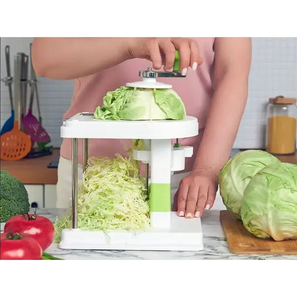 Használata egyszerű: szúrd a fejet a nyársra, állítsd be a kívánt vastagságot, illeszd a nyársat a gépbe, majd forgasd a kart, amíg a káposzta finom szalagokká nem válik.
