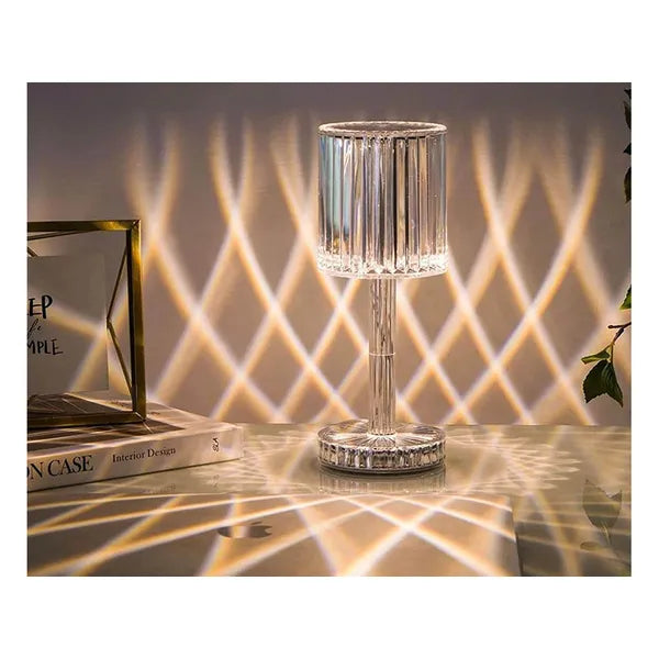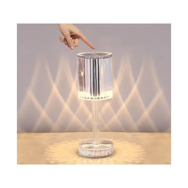 Varázsolj luxus hatást otthonodba ezzel a kristályhatású, RGB LED asztali lámpával! A 25 cm magas, 8 cm átmérőjű ernyő elegáns, prizmaszerű felülete megtöri a fényt, így csillogó, színjátszó mintákat vet a falakra.