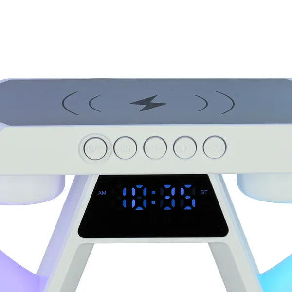 Foglaljon kevesebb helyet, mégis élvezze a maximális funkcionalitást! Ez a modern, fehér LED RGB lámpa egyesíti az éjjeli fényt, a 15 W-os Qi vezeték nélküli töltőt, a Bluetooth hangszórót, az FM-rádiót és az ébresztőórát. Ideális kis lakásokba, irodákba vagy gamer sarokba, ahol minden négyzetcentiméter számít.