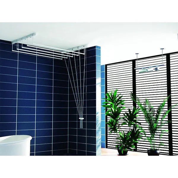 A mennyezeti ruhaszárító ideális megoldás, ha kevés a hely a fürdőszobában vagy az erkélyen, mégis nagy szárítófelületre van szükség. A 180 cm hosszú, egyenként önállóan le- és felengedhető 5 acélrúd megkönnyíti a teregetést, a mennyezetre szerelve pedig értékes padlóterületet szabadít fel. Nedvességálló felülete miatt huzamosabb ideig bírja a párás környezetet, fehér színe pedig bármilyen belső térbe illeszkedik.