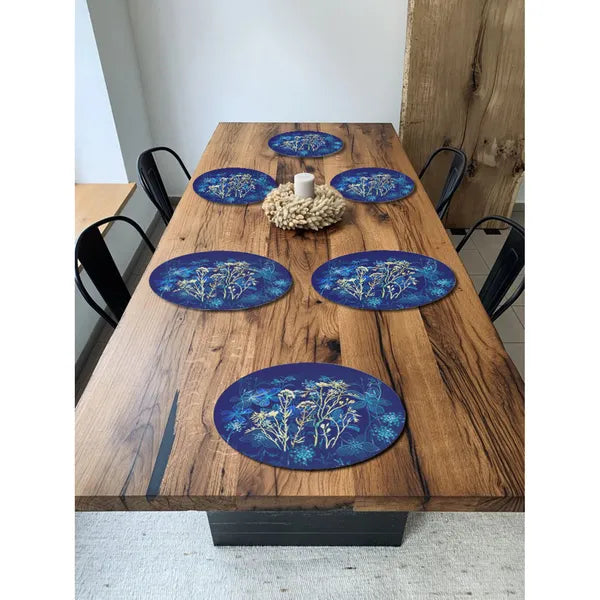 Hozd el az éjféli eleganciát az étkeződbe ezzel a 6 darabos, kerek alátétszettel! A 33 cm átmérőjű, vékonyra préselt poliészter filc megóvja az asztallapot a hő- és nedvességfoltoktól, miközben részletgazdag HD nyomata stílusos látványt kínál.