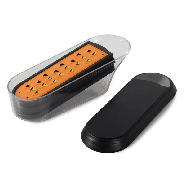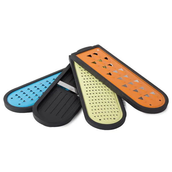 Használat: illeszd a kívánt pengét a keretbe, helyezd a tartályra, majd húzd végig a zöldséget vagy gyümölcsöt. A fedél felhelyezésével azonnal hűtőbe teheted vagy magaddal viheted.