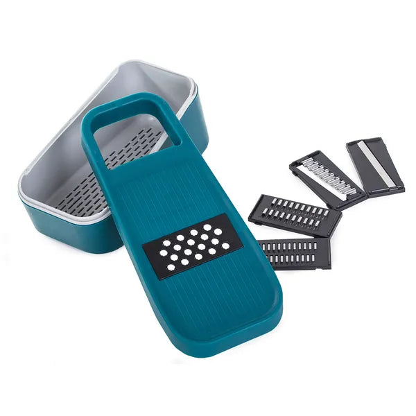 Multifunkciós zöldség- és gyümölcsszeletelő, 5 acél penge, kosár, kék