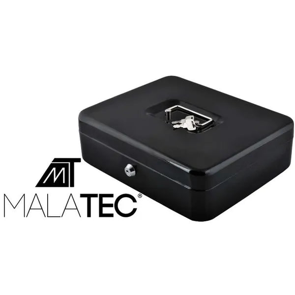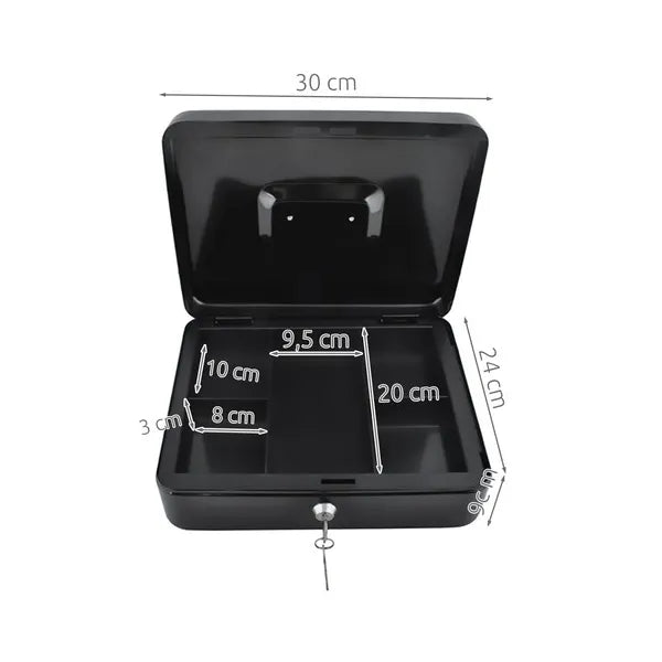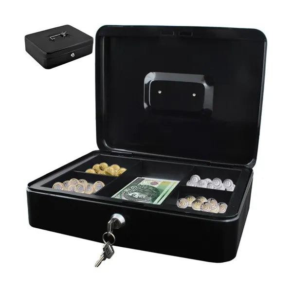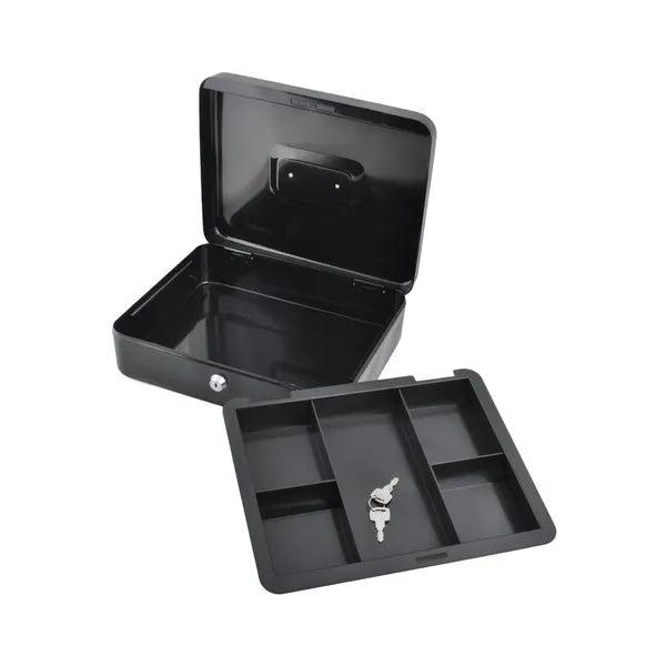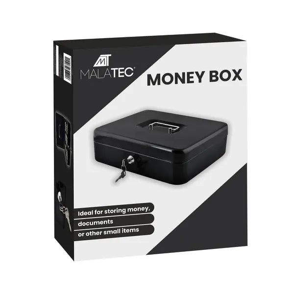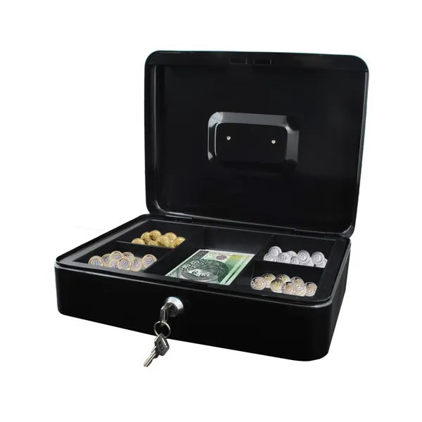 Biztonságos készpénz- és értéktárolás otthon, irodában vagy rendezvényen – a nagy, fekete fém pénzkazetta masszív, préselt acéllemezből készült, és két egyedi kulccsal zárható.