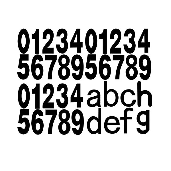- Teljes betű- és számkészlet – 3 db 0-9 számsor és 1 ív (a–h) betű matrica a személyre szabott felirathoz.