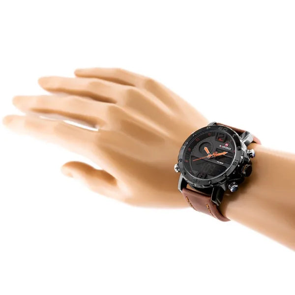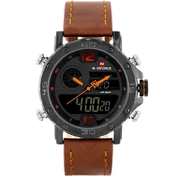 Naviforce NF9134 férfi analóg-digitális karóra, fekete számlap, bőr szíj
