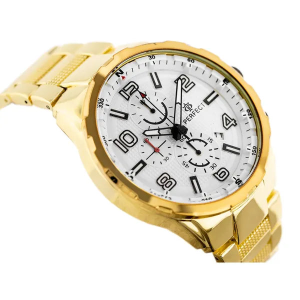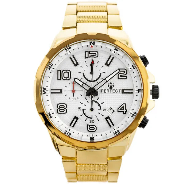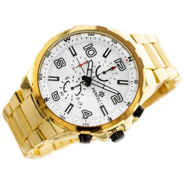 A Perfect CH05M kronográf karóra a modern férfi elegáns kiegészítője: arany tónusú fémszíjjal és letisztult fehér számlappal kombinálja a stílust és a funkcionalitást. A megbízható japán Miyota kvarc szerkezet pontos időmérést biztosít, míg a kronográf és a dátumkijelző extra praktikumot ad.