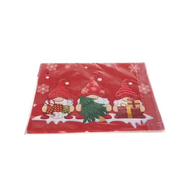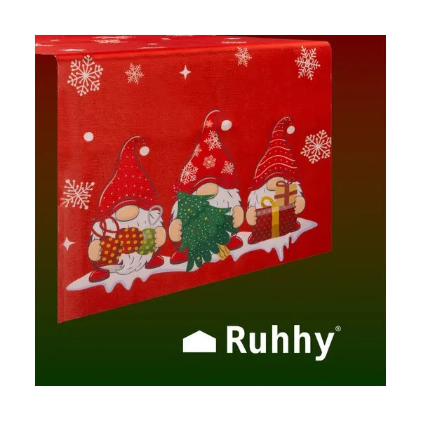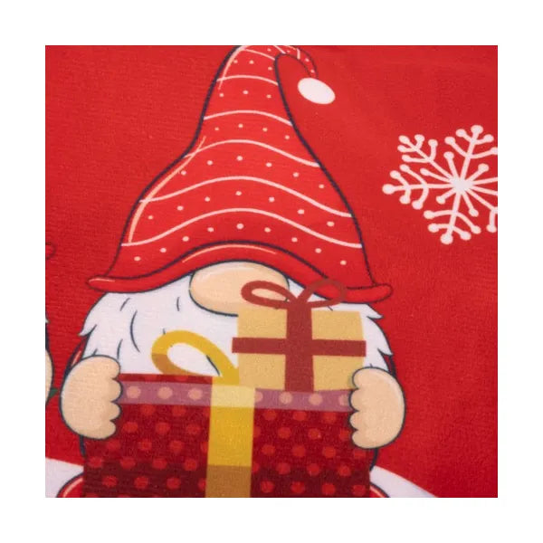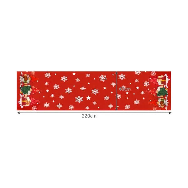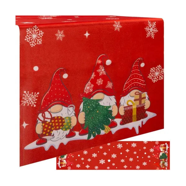 Piros karácsonyi asztali futó manó mintával, poliészter, 220×40 cm