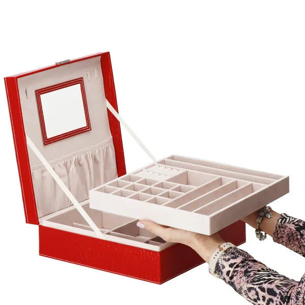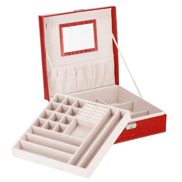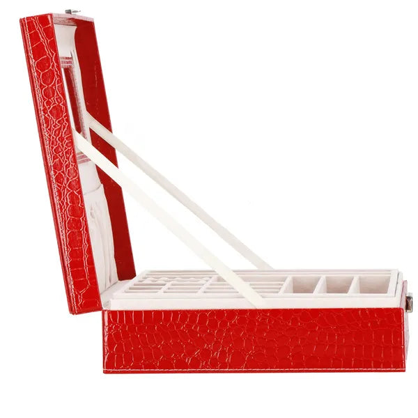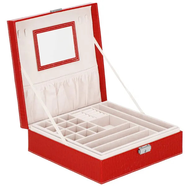 Piros ökobőr ékszerdoboz kulcsos zárral, tükörrel, 26×26×8,5 cm