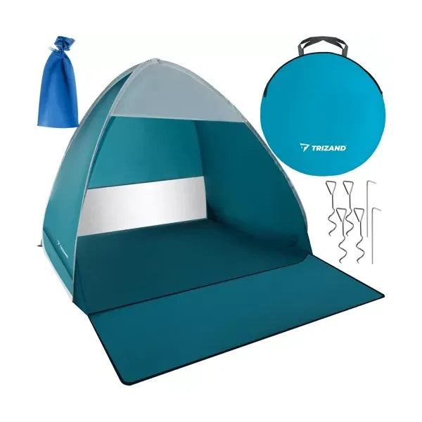 Méretek felállítva: 200 × 150 × 110 cm, két felnőtt számára ideális. Kék–fehér dizájnja stílusosan illik minden nyári programhoz: strandoláshoz, horgászathoz vagy piknikhez. Megóv a homoktól, a széltől és a kíváncsi tekintetektől, miközben zavartalan pihenést és olvasást tesz lehetővé.