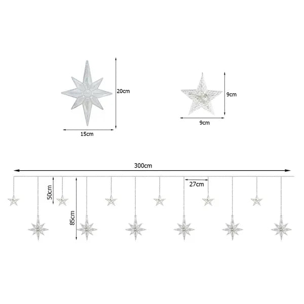 Varázsolj ünnepi, meghitt fényt otthonodba ezzel az energiatakarékos, sokszínű LED fényfüggönnyel! A 6 nagy és 6 kicsi csillag alakú motívum 138 darab RGB LED-del világít, így az ablak, a fal vagy a vitrin egyetlen gombnyomásra tündököl.