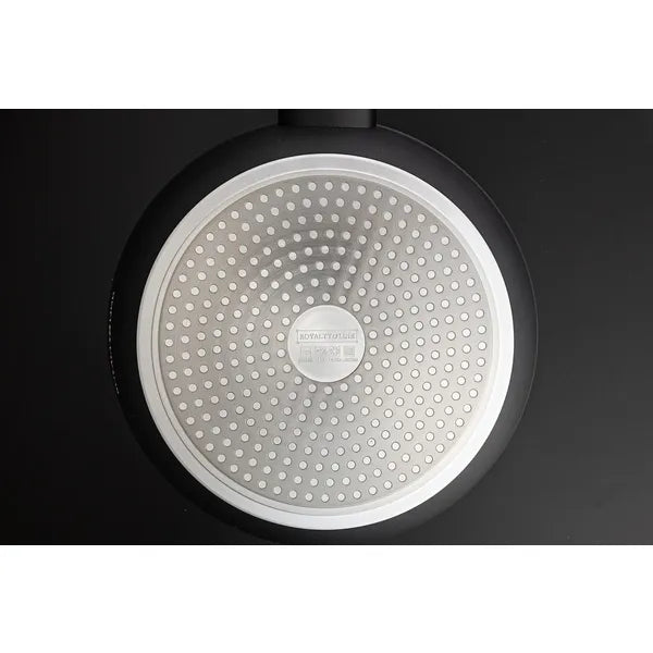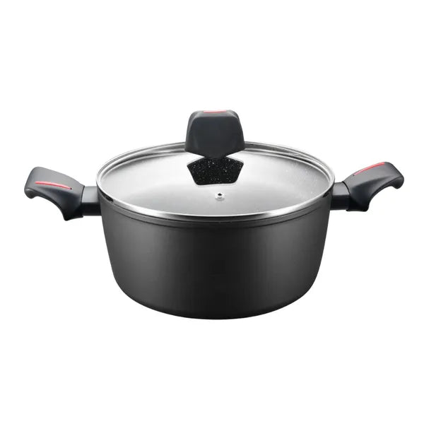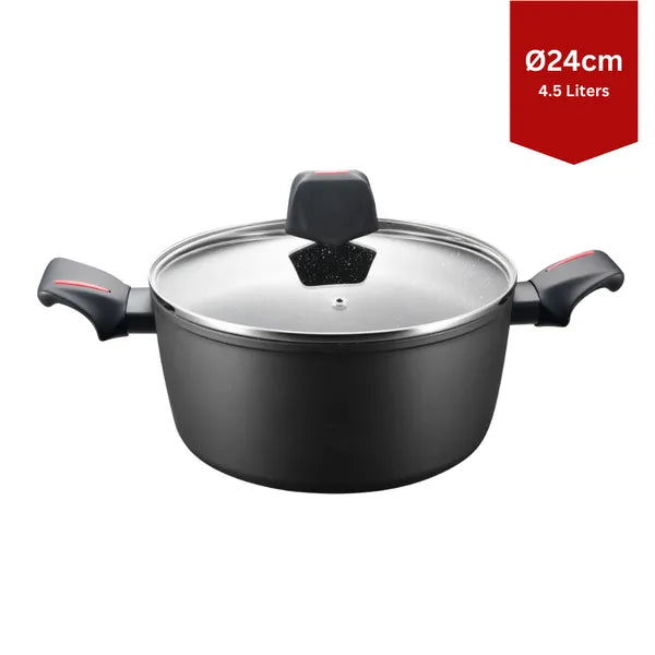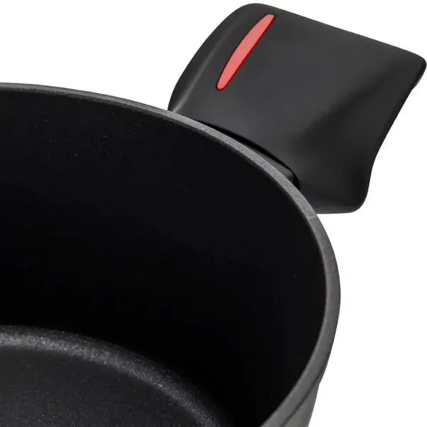 Anyag: öntött alumínium | Bevonat: Greblon márvány | Méret: Ø24 cm | Űrtartalom: 4,5 l | Fogantyú: szilikon | Fedő: edzett üveg | Szín: fekete