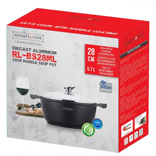 A Royalty Line 28 cm-es, 5,7 literes márványbevonatos főzőedény tökéletes választás levesekhez, pörköltekhez és minden olyan fogáshoz, amely nagyobb űrtartalmat igényel. A tapadásmentes márványréteg egyszerű tisztítást, a masszív, öntött alumínium test egyenletes hőeloszlást biztosít. Az edényt erősített, edzett üvegfedő zárja, így főzés közben is figyelheti az ételt.