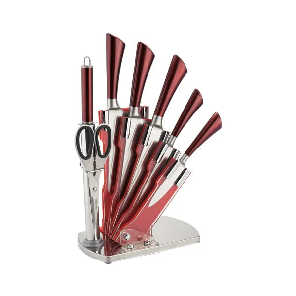 Elegáns, 8 részes Royalty Line késkészlet, amely minden konyhai feladathoz biztosítja a megfelelő szerszámot. A rozsdamentes acél pengék tapadásmentes bevonattal rendelkeznek, így a vágás könnyed és pontos. Ergonomikus, csúszásmentes markolat gondoskodik a biztos fogásról, míg a modern plexi állvány látványosan és higiénikusan tárolja a késeket.