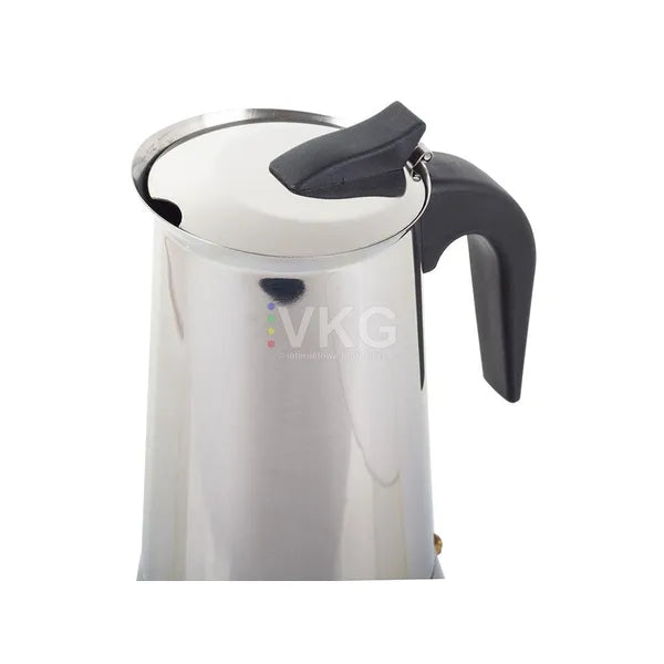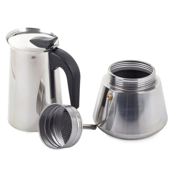 Élvezze az intenzív, olasz stílusú kávé ízét ezzel a nagyméretű, 600 ml-es kotyogós kávéfőzővel, amely rozsdamentes acélból készült, és fényes polírozott felületének köszönhetően elegáns kiegészítője a konyhának.