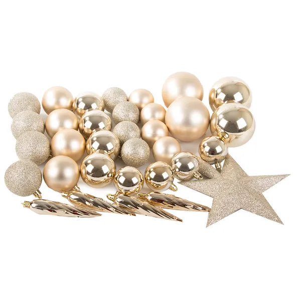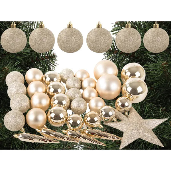 A csomag tartalma: 2 db 8 cm matt, 2 db 8 cm csillámos, 4 db 6 cm matt, 8 db 6 cm csillámos, 4 db 5 cm matt, 8 db 5 cm csillámos gömb, 4 db jégcsap és 1 db Betlehemi csillag.