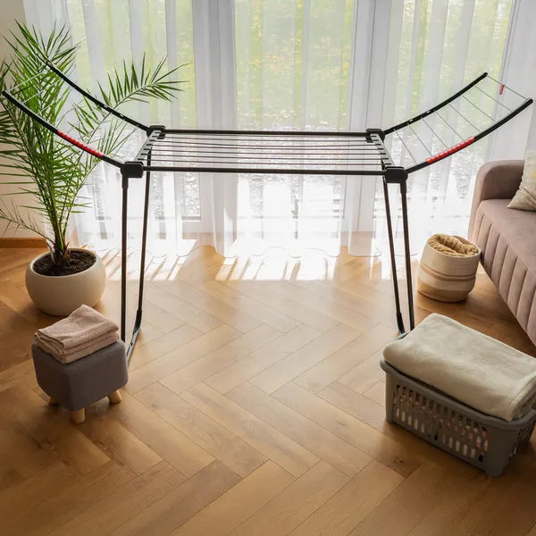 A Springos összehajtható ruhaszárító állvány ideális választás, ha helytakarékos és nagy kapacitású szárítási megoldást keresel a lakásban vagy az erkélyen. Fekete színű, porszórt acél váza erős és korrózióálló, a műanyag elemek pedig könnyű kezelhetőséget biztosítanak.