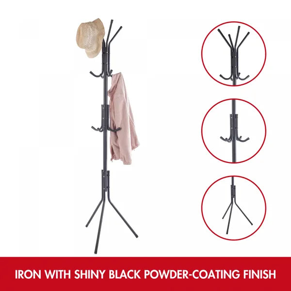 Szabadon álló, 12 akasztós kabáttartó állvány, fekete, 172×42 cm, acél