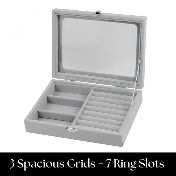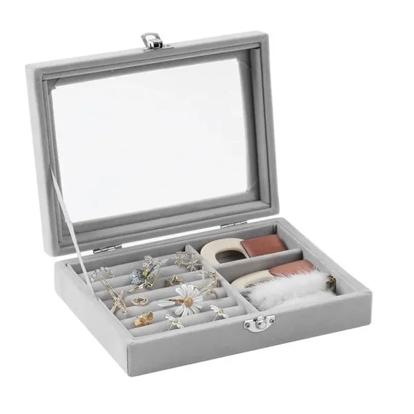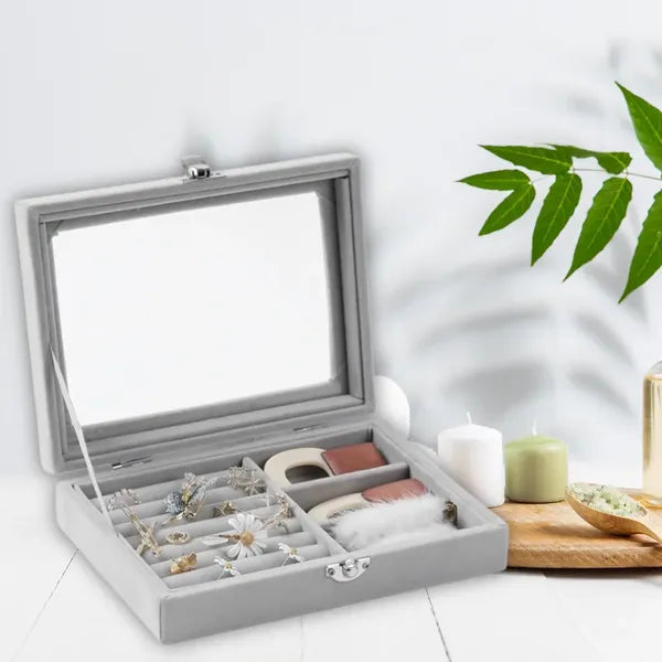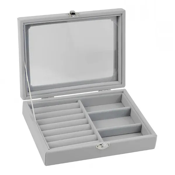 Mutasd meg ékszereidet stílusosan és óvd meg őket a portól ezzel a kompakt, szürke velúr ékszerdobozzal, amelynek átlátszó üvegtetője gyors áttekintést tesz lehetővé.