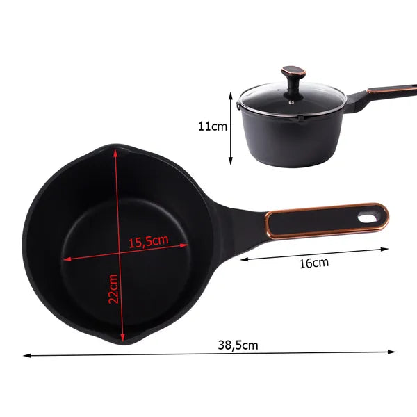 - Méretek: Ø22 cm (felső), magasság 11 cm, főzőfelület Ø15,5 cm, nyél 16 cm