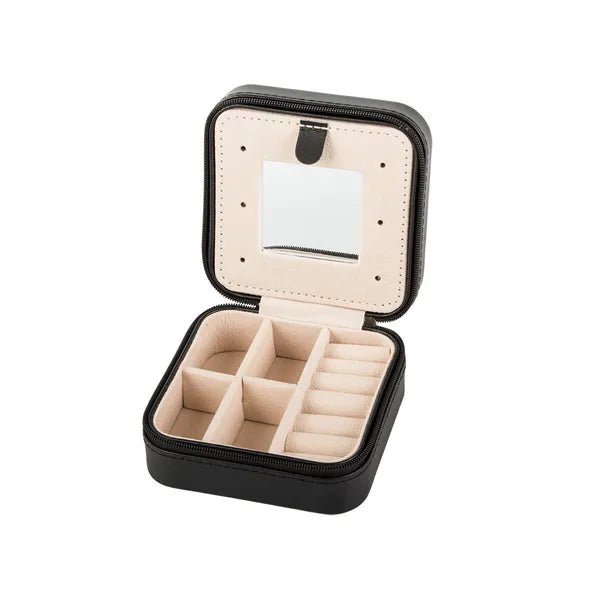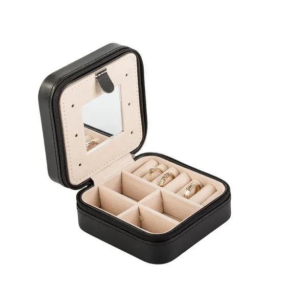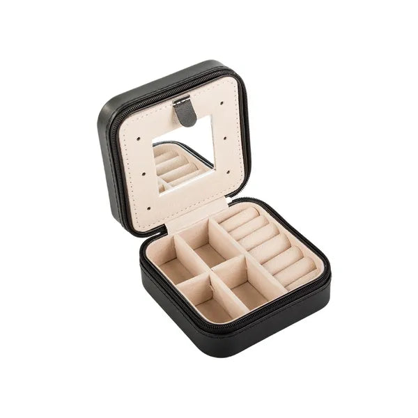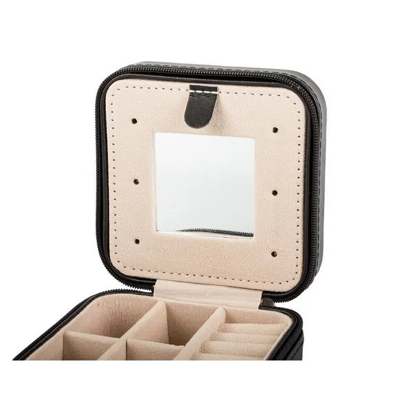 Helyezd a gyűrűket a párnázott sorokba, a nyakláncokat a mélyebb rekeszekbe, és használd a tükörrel ellátott fedelet a gyors öltözködéshez. A zárnak köszönhetően a doboz biztonságban marad a bőröndben is.