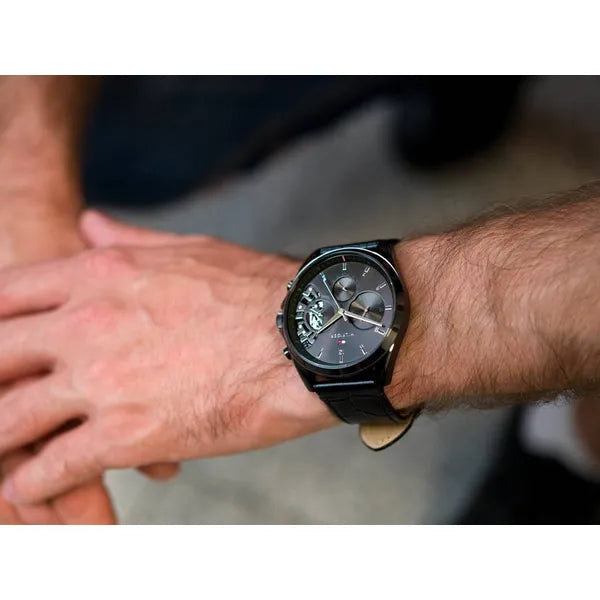 A Tommy Hilfiger Baker 1710452 férfi karóra modern eleganciát és mindennapi praktikusságot ötvöz. A 44 mm-es, fekete PVD-bevonatú 316L rozsdamentes acél tokban japán kvarc szerkezet dolgozik, amely körülbelül 2 évnyi elemélettartamot biztosít. A grafitszürke számlapot ásványi üveg védi, a jobb oldalon részben látható mechanika, míg 12 óránál a márka jellegzetes logója emeli ki az órát.