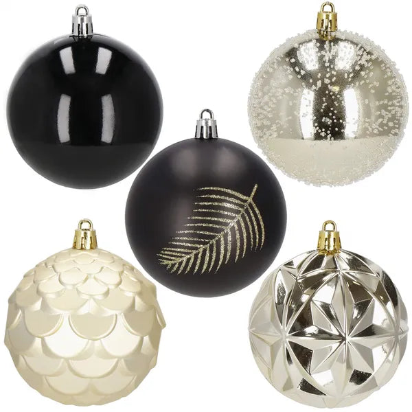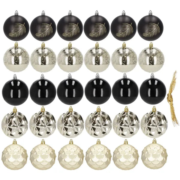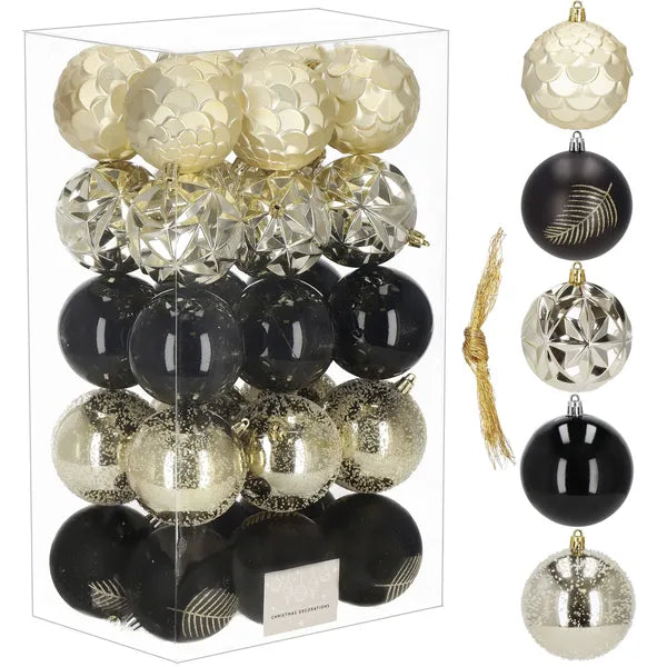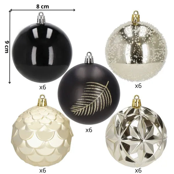 A 30 darabos, 8 cm átmérőjű arany–fekete karácsonyfagömb készlettel könnyedén varázsolhat elegáns és modern hangulatot otthonába. A műanyagból készült, ütésálló díszek között matt, fényes, csillámos és texturált felületű gömbök váltakoznak, így a fa minden oldalról változatos és látványos lesz.