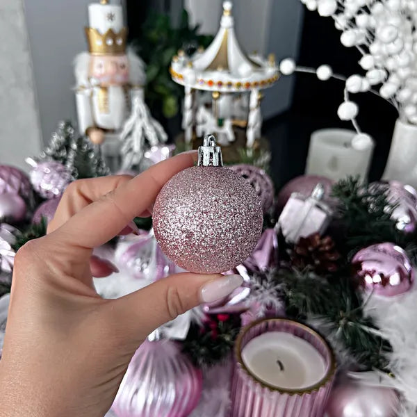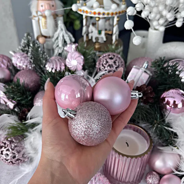 Törhetetlen rózsaszín karácsonyfadísz készlet 33 db, 5–13 cm