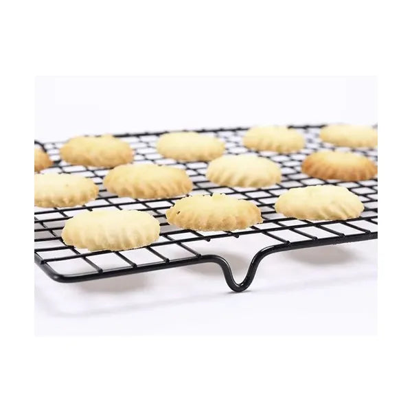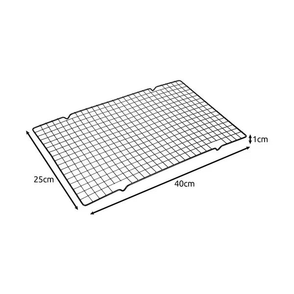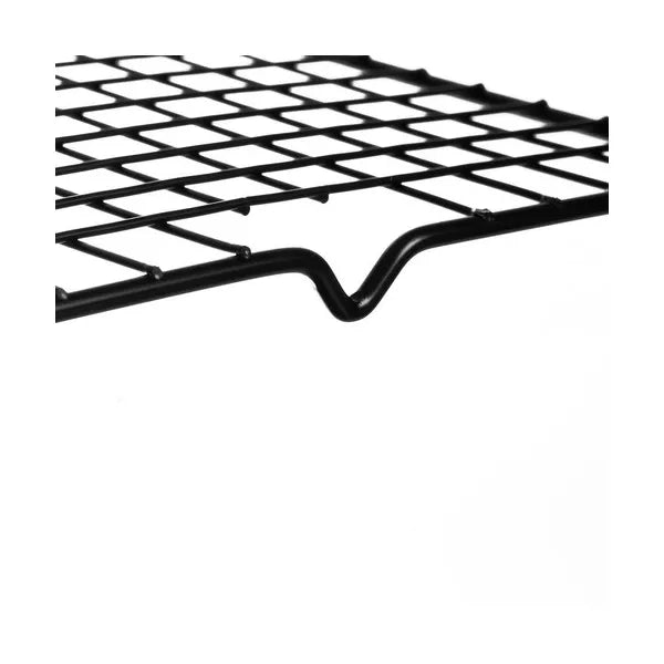 A 40×25 cm-es szénacél hűtőrács elengedhetetlen eszköz minden sütni szerető otthonában és professzionális cukrászműhelyben. Stabil, négy lábbal támaszkodik a munkalapra, így a levegő minden irányból szabadon áramlik, a piskóta, keksz vagy tortalap gyorsan és egyenletesen hűl le.