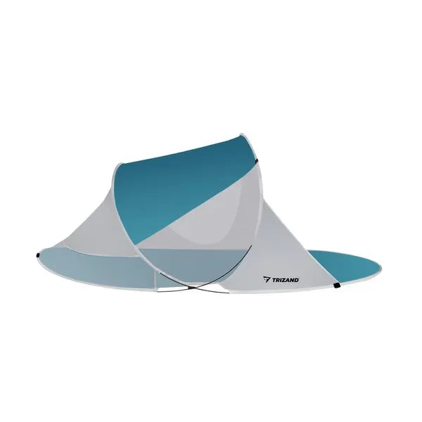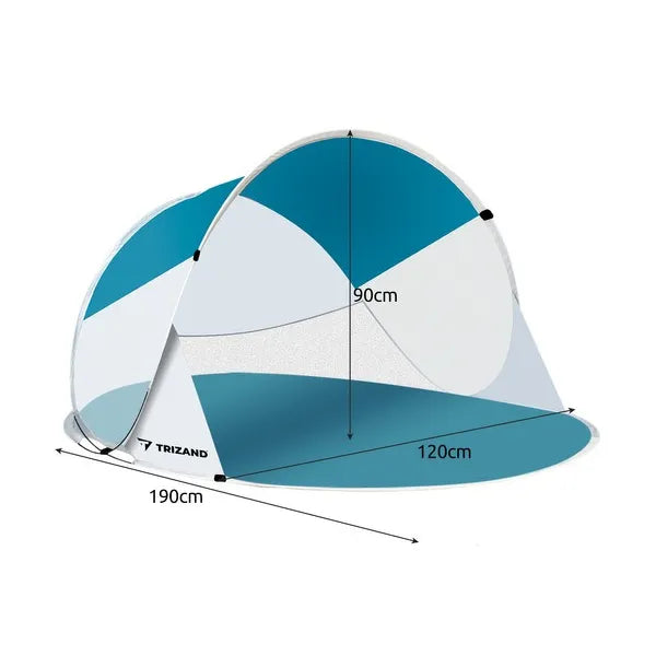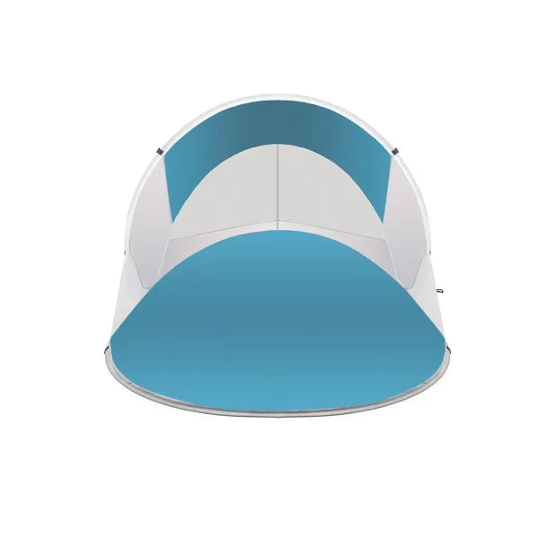 A turkiz–fehér pop-up strandsátor ideális választás a tengerpartra, kempingbe vagy a kertbe, ha árnyékra és rovarmentes pihenőhelyre vágyik. Rugalmas üvegszálas váza révén a tokból kivéve 2 másodperc alatt felugrik, a hálós oldalfalak pedig hűs levegőt engednek be, miközben távol tartják a szúnyogokat.