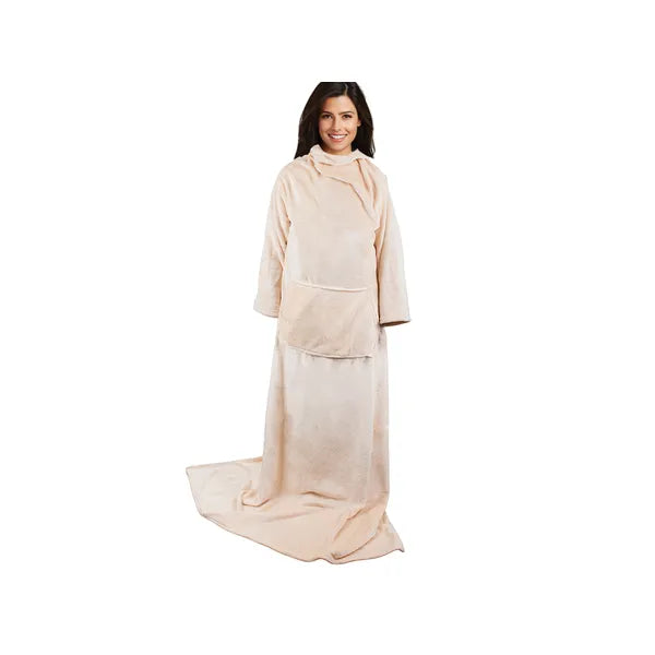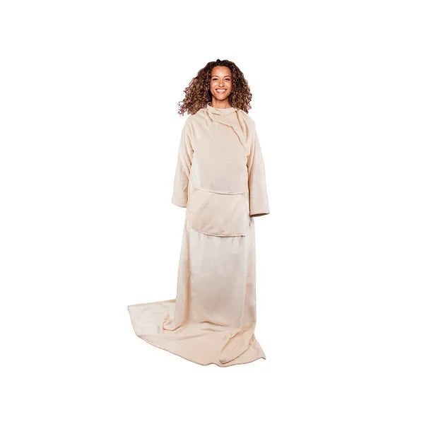 Élvezd a teljes testet átölelő, puha meleget anélkül, hogy lecsúszna a takaró: a bézs színű ujjas polártakaró ideális társ pihenéshez, filmnézéshez vagy otthoni munkához.