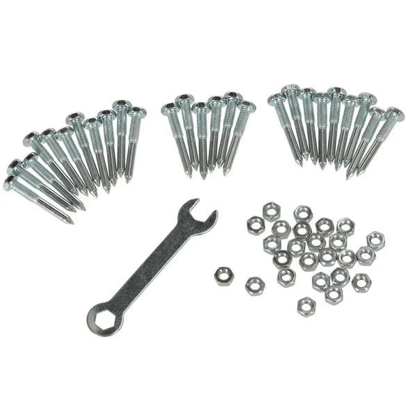 - A csomag tartalma: 2 db talplemez, 26 db tüske, 26 db anya, 4 db rögzítőpánt, villáskulcs.