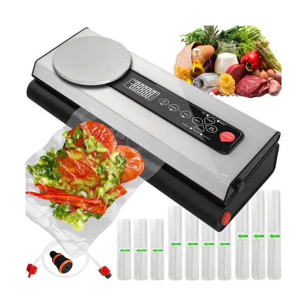 A vákuum fóliahegesztő beépített digitális mérleggel ideális megoldás a háztartásban vagy utazás közben, ha szeretné megőrizni az ételek frissességét és ízét.