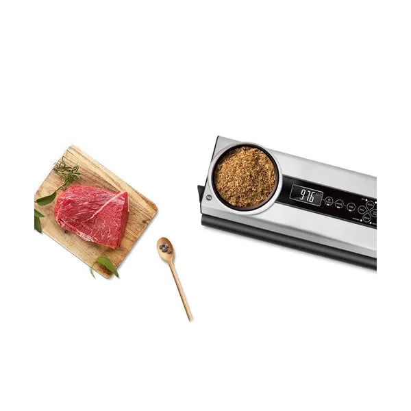 - Beépített mérleg: 2 kg kapacitás, 1 g pontosság – a csomagolás előtt pontosan adagolhatja az alapanyagokat.