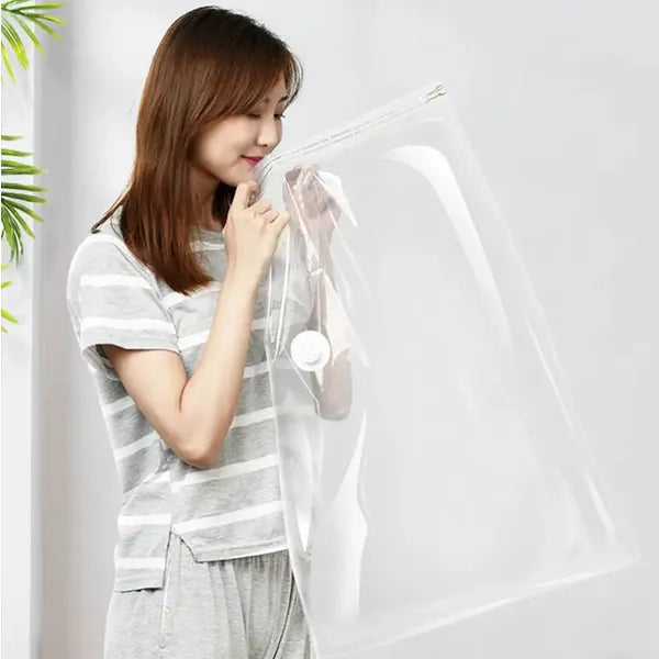 Használat: helyezze a tiszta, száraz textíliákat a zsákba, húzza végig a zipzárat a mellékelt csúszkával, majd csatlakoztassa a porszívó csövét a szelephez és szívja ki a levegőt. A vákuum megszüntetéséhez egyszerűen nyissa ki a szelepet.