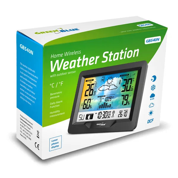 Nem szeretnél többé találgatni az időjárásról? A GreenBlue GB540N vezeték nélküli időjárás-állomás nagy, színes kijelzőjén minden fontos adat azonnal látható: beltéri és kültéri hőmérséklet, páratartalom, légnyomás, grafikus előrejelzés, valamint a Hold aktuális fázisa. A beépített DCF rádiójel-vevő automatikusan beállítja a pontos időt, így soha nem kell manuálisan állítani az órát.