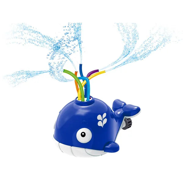 - Vidám dizájn: kék bálna színes, hajlékony csövekkel, amelyek minden irányba permetezik a vizet.