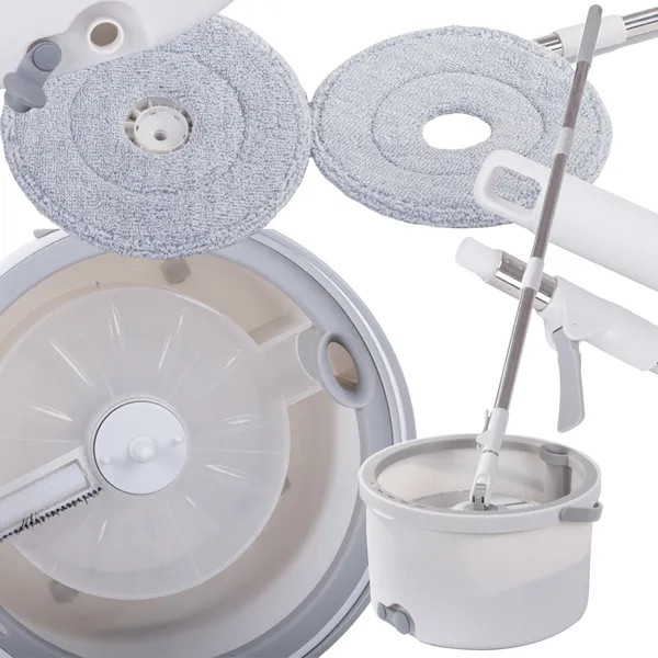 Méretek: vödör 33,5 × 19 cm, fej átmérő 24 cm, nyél hossza 110–130 cm. A csomag tartalma: forgó felmosó, kétkamrás vödör kerekekkel, 2 mikroszálas párna, eredeti doboz.