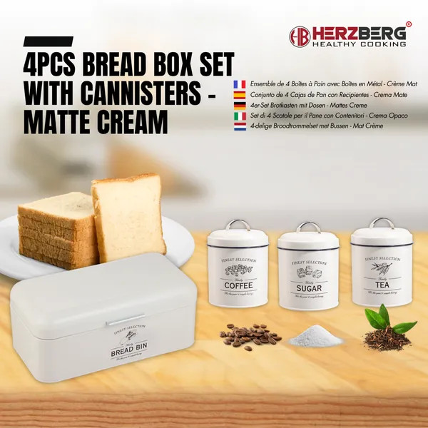 Dobd fel a konyhapultot ezzel a rusztikus, matt krém színű, 4 darabos kenyértartó és tároló szettel, amely egyszerre kínál stílust és praktikumot. A porfestett, galvanizált acél test ételbiztos felületet, optimális szellőzést és hosszan tartó frissességet biztosít a pékáru és az alapanyagok számára.