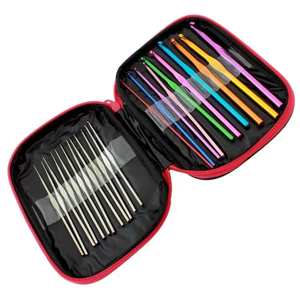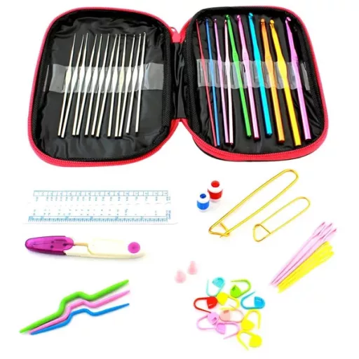 Akár 50 darabos horgoló készlet. Tökéletes ajándék amatőr horgolóknak és hímzőknek. Minden horgolóhorog erős alumíniumból készült, és tökéletesen fekszik a kézben, így profiknak is alkalmas. A praktikus, cipzáras tokban számos egyéb kiegészítőnek is van hely (tűk, biztosítótűk, olló, vonalzó stb.) Ez a tökéletes készlet a horgolási kalandok megkezdéséhez!