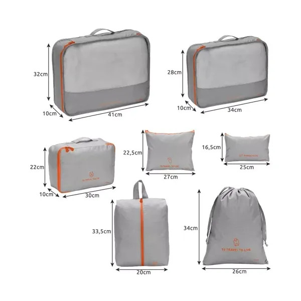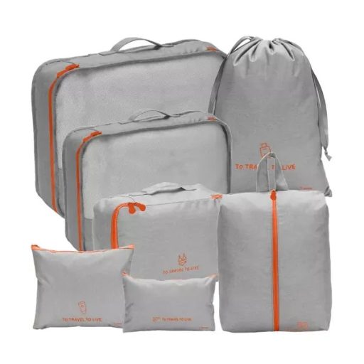 Készülj fel rendezetten az utazásra a 7 részes utazási rendszerező készlettel! A különböző méretű táskák segítenek elkülöníteni a ruhákat, fehérneműt, cipőt, kozmetikumokat és elektronikai kiegészítőket, így sosem kell a bőrönd alját feltúrnod a keresett holmiért.