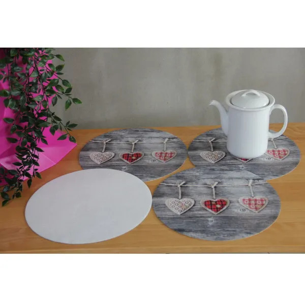 Az Hearts mintás kerek asztali alátét szett 4 darab, 33 cm átmérőjű alátétet tartalmaz, amelyek megbízható védelmet nyújtanak az étkező- vagy konyhaasztal felületének a karcolásokkal, hőfoltokkal és kiömlött italokkal szemben. A vékony, spraszasztott poliészter filc kellemes tapintású, halk felületet ad, és HD minőségű nyomattal díszített, amely hosszú ideig megőrzi élénk színeit.