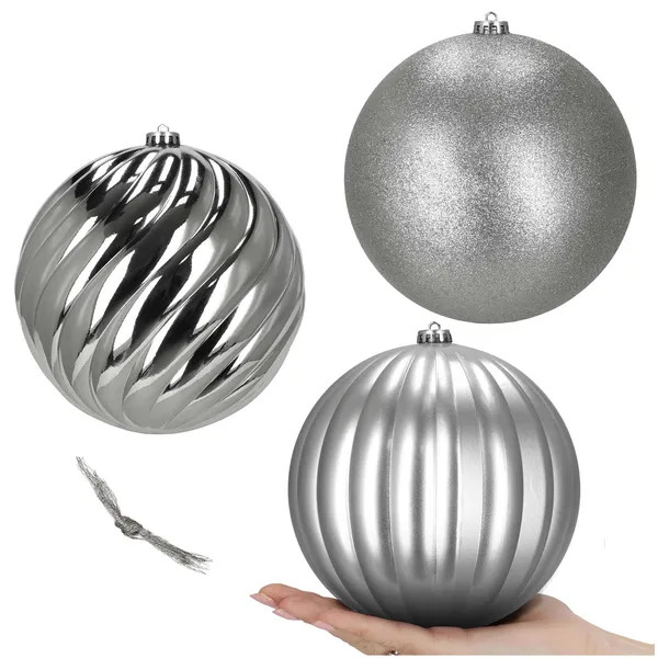 Elegáns ezüst díszgömb szett, amely háromféle felülettel (fényes, félmatt, csillámos) ad változatos, mégis harmonikus megjelenést a fának. Törhetetlen műanyagból készült, ezért biztonságosabb választás gyerekek és háziállatok mellett, a felakasztáshoz zsinórok is járnak.