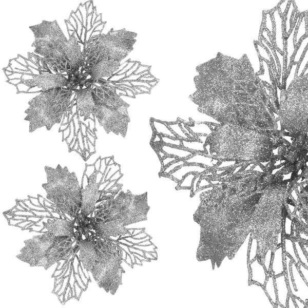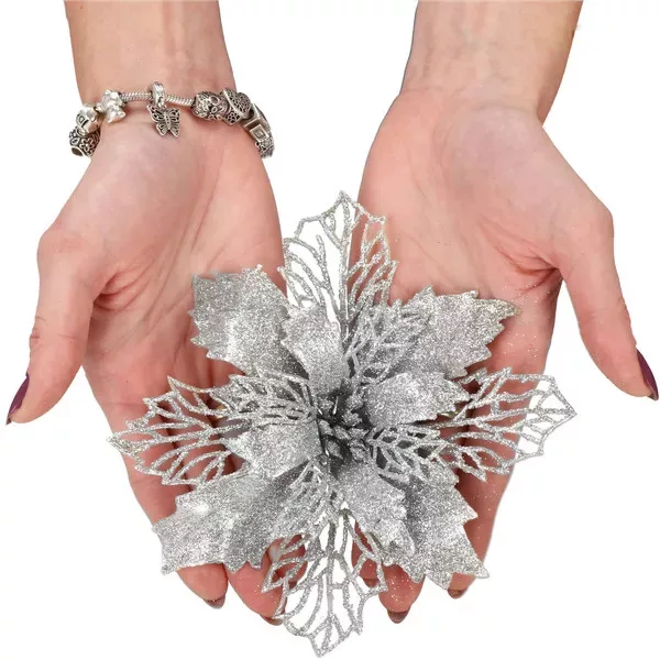Dobd fel az ünnepi dekorációt ezzel az elegáns, ezüst színű mikulásvirág díszszel, amely 16 cm-es átmérőjével látványos kiegészítője lehet karácsonyfának, adventi koszorúnak vagy asztali kompozíciónak.