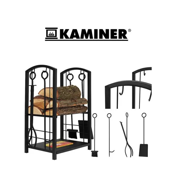 Elegáns, matt fekete színű acél kandalló-állvány, amely egyszerre szolgál famozgóként és teljes gondozókészletként. A 30 kg-ig terhelhető, kétpolcos állvány tetején a tűzifát, alján pedig a gyújtóst vagy kiegészítőket tárolhatod, így a nappali környezete rendezett és tiszta marad.