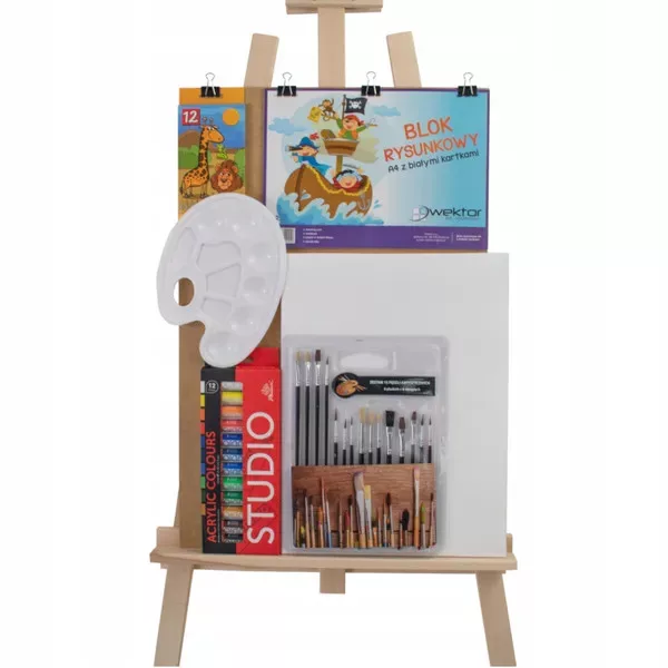 Nagyméretű, komplett festőkészlet, amely minden szükséges eszközt biztosít a hobbi és profi művészek számára. A stabil, bükkfából készült állítható állványtól kezdve a 12×12 ml-es akrilfestékeken át a 15 darabos ecsetkészletig mindent megtalálsz a dobozban, hogy azonnal belekezdhess az alkotásba.
