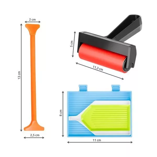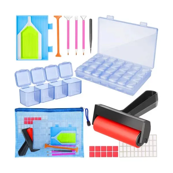 Teljes kiegészítőcsomag a gyémántszemes kirakók kényelmes és rendezett elkészítéséhez. A készletben mindent megtalálsz, amire szükség lehet a strasszok gyors, pontos felhelyezéséhez és az apró gyöngyök rendszerezéséhez.